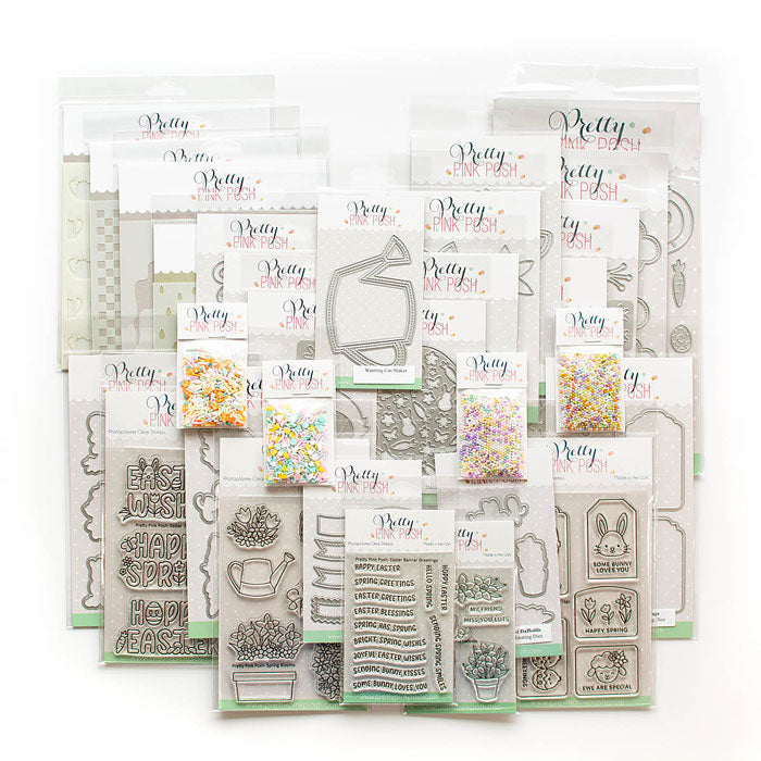 Items included: Easter Banner Greetings stamp set, Easter Tags stamp set, Easter Word Scenes stamps set, Potted Daffodils stamp set, Spring Blooms stamp set, Easter Tags coordinating dies, Easter Word Scenes coordinating dies, Potted Daffodils coordinating dies, Spring Blooms coordinating dies, Banner Greetings 3 die set, Chick Holder die set, Chick Shaker die set, Daffodil Shaker die set, Decorative Easter Egg die set, Easter Bunny Mugs die set, Eyelet Diamonds die set, Large Easter Shadow die set, Large Spring Shadow die set, Springtime Holder Additions die set, Stitched Clouds die set, Stitched Spring Flowers die set, Watering Can Shaker die set, Layered Watering Can Floral stencils,, Mini Checker stencil, Raindrops stencil, Watercolor Circle with Mask stencil, Bunny Hop shaker beads, Pastel Dreams shaker beads, Spring Carrots clay confetti and Springtime Bunny clay confetti.