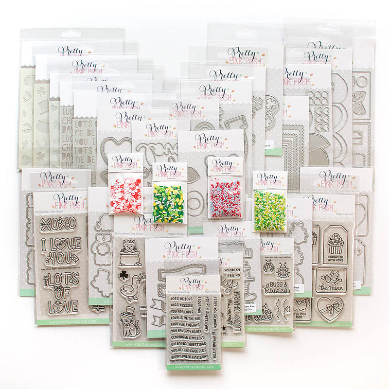 Items included: Lovely Ladybugs stamp set, Lucky Animals stamp set, Lucky To Know You stamp set, Valentine Banner Greetings stamp set, Valentine Tags stamp set, Valentine Word Scenes stamp set, Lovely Ladybugs coordinating dies, Lucky Animals coordinating dies, Lucky To Know You coordinating dies, Valentine Tags coordinating dies, Valentine Word Scenes coordinating dies, Banner Greetings 2 die set, Bear Holder die set Box of Chocolates die set, Decorative Shamrock die set, Heart Card Base die set, Horseshoe Shaker die set, Ladybug Shaker die set, Love You Shadow die set, Lucky Holder Additions die set, Pinking Rectangles die set, Shamrock Border die set, XOXO Word Shaker die set, Layered Cupid Items stencils, Layered Ladybugs stencils, Layered Lucky Items stencils, Love Words stencil, Lucky Words stencil, Best of Luck shaker beads, Love Is Kind shaker beads, Lucky clay confetti and Sweet XOXO clay confetti.